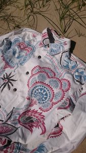Vintage creamy cotton hand printed shirt, produced, designed in England for Workers For Freedom.