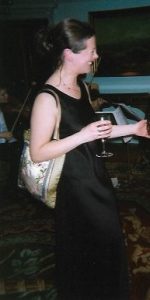 Long Quinta C Italy black satin feel dress 1994, ‘Vest Dress’, effortless, not too tried, worn with silk embroidered small shopping bag.