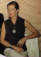 John Galliano, sleeveless, jacket , Stone coloured high waisted,pleated trousers 1990’s, pendant vintage market, ring Jewellery designer Tom Mc, earrings NY market.