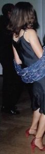 Long Quinta C Italy black satin feel dress 1994, ‘Vest Dress’, effortless, not too tried, worn with silk embroidered small shopping bag.
